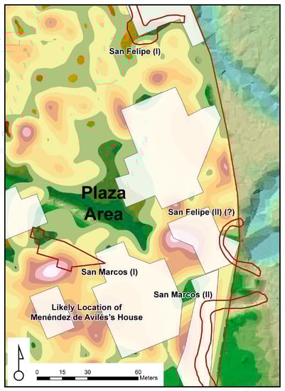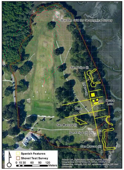 - Thompson, V.D.; DePratter, C.B.; Roberts Thompson, A.D. Defining Santa Elena’s Colonial Landscape through Shallow Geophysics. J. Archaeol. Sci. Rep. 2016, 9, 178–190. [Google Scholar]