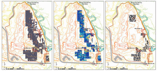 In the spring of 1994, Chester DePratter and Stanley South set out to define the spatial extent of Santa Elena. To this end, they conducted a systematic shovel test survey at 30-foot (9.15 m) intervals over the entire site. This resulted in a total of 1383 shovel test pits (shovel test dimensions 0.9′ × 1.8′) (Figure 2) that were excavated in natural levels to the base of occupation and screened through ¼” mesh []. All materials recovered from the shovel test survey were analyzed and then categorized into major time periods. DePratter and South [] present distribution maps of these data in their original report. The vast majority of the cultural deposits at Santa Elena lie within the first meter or less, usually the first 30 cm, below the surface, and therefore this precluded an in-depth evaluation or discussion of how changes in stratigraphy correspond to the geophysical data.