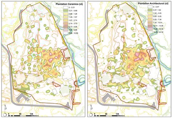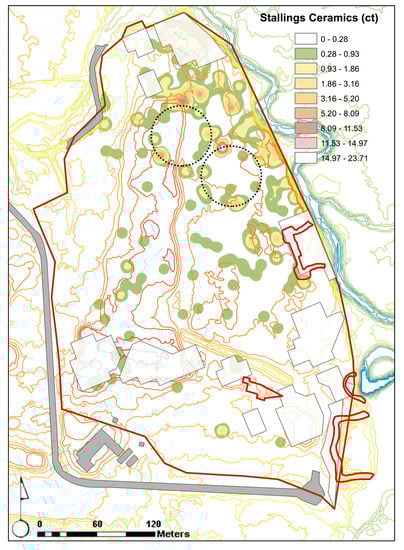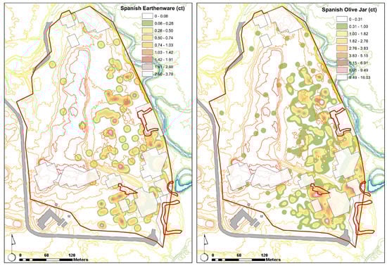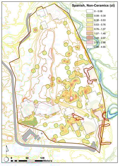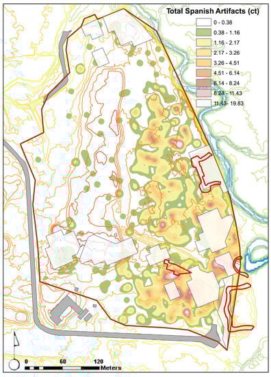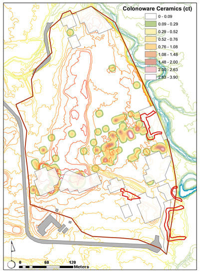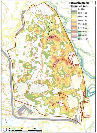 In yet another dramatic turn in spatial organization, the Irene and Altamaha distribution of ceramics appears to cover the entire site, representing the most intensive and expansive native occupation at Santa Elena (Figure 8). The reason for this is twofold. The first is that, at this point, we cannot differentiate Irene and Altamaha ceramics, as this was not done in the original analysis of the ceramic sherds. Therefore, this time frame includes occupation prior to the European occupation of Santa Elena and a second post-Spanish Native American occupation of the locale, possibly lasting through to the 1700s. The second reason for this distribution is that the Irene phase for much of the Georgia and South Carolina coast represents a dramatic increase in site size and number, and large sites are common during this period. Also, they tend to be characterized by numerous household clusters with some sites having up to 600 individual middens associated with household groups [,,,,].