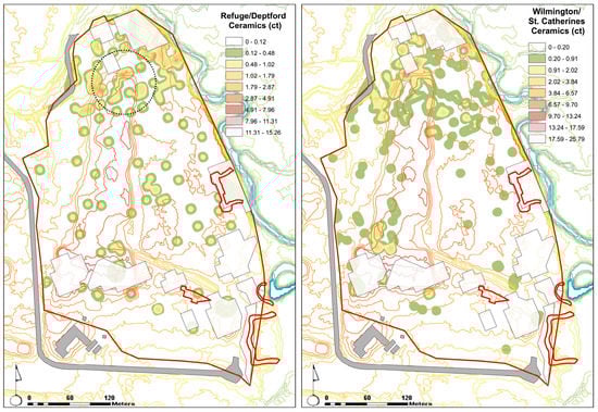 The distribution of Refuge/Deptford period (left) and Wilmington/St. Catherine’s period (right) ceramics recorded through a shovel test survey. Circular pattern referenced in the text is indicated by a dashed circle. Areas whited-out were not shovel tested. Contour spacing is 1 m. Contours are based on the LiDAR dataset and use the NAD 1983 and NAV 1988 horizontal and vertical datum, respectively.