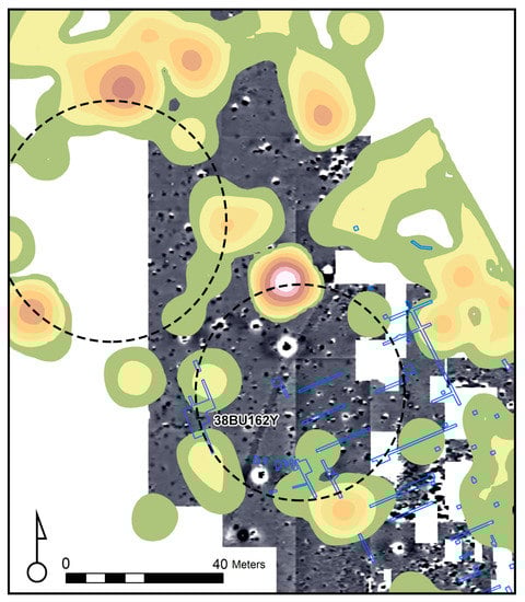 Two circular patterns identified in the distribution of Stallings ceramics as recorded through a shovel test survey including the location of excavation unit 38BU162Y where a potential Stallings period house floor was identified. The legend for the distribution of Stallings period ceramics is the same as that used in Figure 5. Distribution data is underlain by a gradiometer survey.
