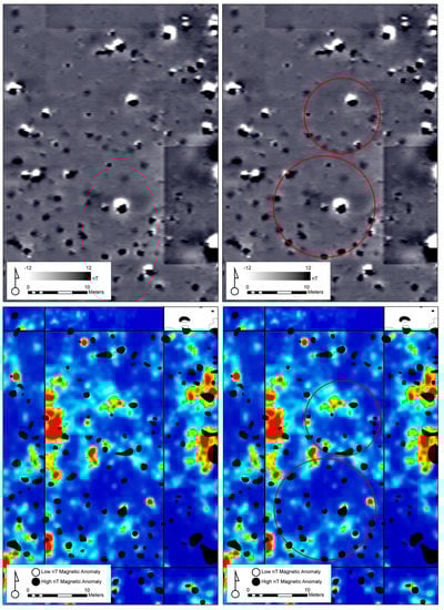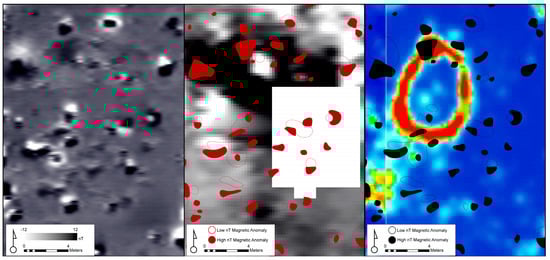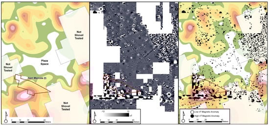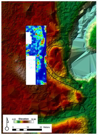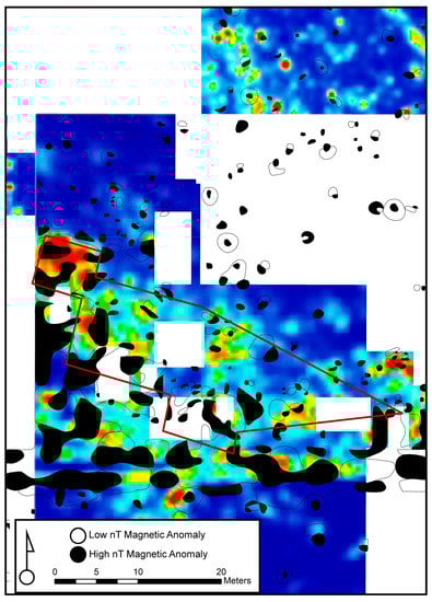 Kvamme [] and Gater and Gaffney [] provide in-depth discussions for magnetic surveys in archaeology. Our work at Santa Elena used a Bartington (Oxon, UK) Grad-601 Fluxgate Gradiometer. Our survey methods did not deviate from our previous research at the site []. We collected data in 50 cm transects at eight samples per meter. Early in the planning for our large-scale survey we considered using one of the large cart arrays commonly employed in landscape surveys across the UK and increasingly in the Midwestern and Southeast United States [,,,,,,,,]; however, due to funding constraints and the fact we had enough labor and time, we ultimately decided against this method. We processed all data using TerraSurveyor, following Gater and Gaffney []. We then georeferenced all magnetic survey maps in GIS for assessment with other data sets (Figure 4).