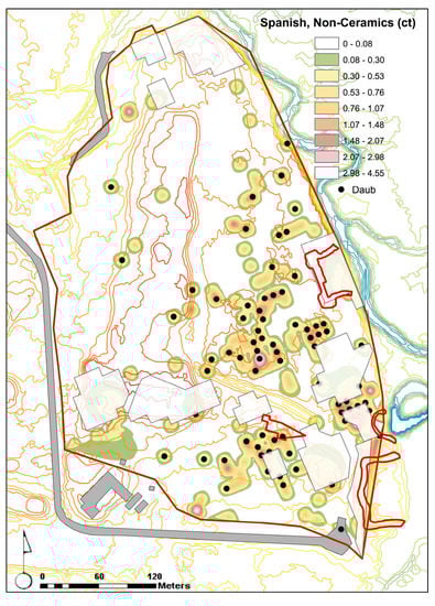 The distribution of Spanish period non-ceramic materials and the location of shovel tests yielding daub, likely of Spanish origin. Areas whited-out were not shovel tested. Contour spacing is 1 m. Contours are based on the LiDAR dataset and use the NAD 1983 and NAV 1988 horizontal and vertical datum, respectively.