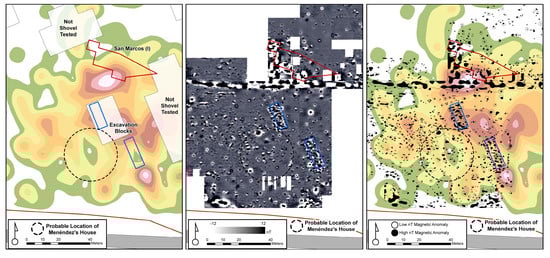 Spanish artifact distribution (left) and magnetic gradiometry (center) maps of the potential area within which Pedro Menéndez de Avilés’s house may have been located. Magnetic anomalies are overlain on top of the distribution of Spanish artifacts in the figure to the right. The legend for the distribution of total Spanish artifacts is the same as that used in Figure 10. Areas whited-out were not shovel tested.