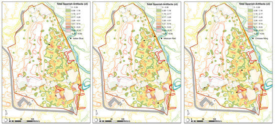 The distribution of all Spanish period artifacts and the location of shovel tests yielding Italian Blue ceramics (left), Mexican Red ceramics (center), and Chinese Ming Dynasty ceramics (right). Areas whited-out were not shovel tested. Contour spacing is 1 m. Contours are based on the LiDAR dataset and use the NAD 1983 and NAV 1988 horizontal and vertical datum, respectively.