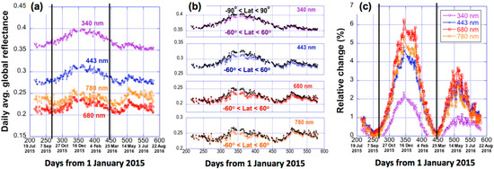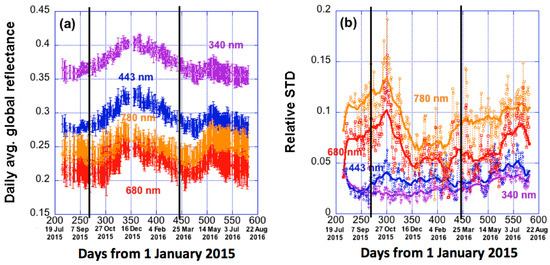 The daily averages of global reflectances display seasonal variations, with a larger peak during boreal winter, and a smaller peak during boreal summer at all wavelengths. For the whole year, the relative standard deviations of daily average reflectance values are 5%, 6%, 11%, and 18% at the four wavelengths (340, 443, 680 and 780 nm), respectfully.