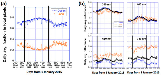 In this paper, we will present statistics of EPIC’s L1-B reflectance data using both Equations (1) and (2) as an approximation to Equation (3). Throughout the whole paper we define the Earth “reflectance” as the ratio between radiant energy reflected by Earth into direction to the sensor and incident solar irradiance as defined by Equations (1) and (2). We note, however, that calculations using both equations gave only slightly different numerical values and displayed very similar behaviors. Therefore, for convenience, we present only the figures from Equation (2), and provide the statistical values from both methods if their differences are significant.