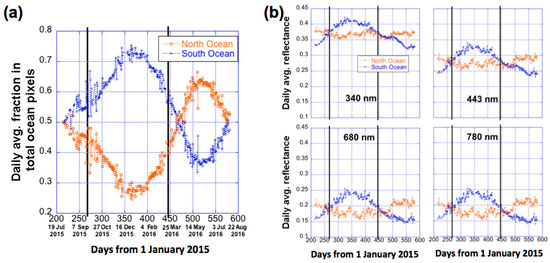 Figure 4) that the seasonal variations are mostly determined by ocean areas, simply because the daily average fraction of oceans over the sunlit side of the Earth is always much larger (65–80% depending on season; with maximum during boreal winter) than the fraction of land. It is also found that the variations over oceans are dominated in August–April by southern hemisphere and in April–August from northern hemispheres; they follow very different patterns (