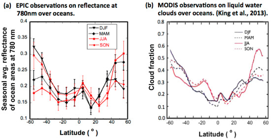 To understand the cloud effects on the northern and southern ocean reflectance, we analyzed the latitude dependence of 780 nm reflectances over oceans. Results showed that in boreal winter, reflectances of Southern oceans are larger at the high latitudes than at other latitudes, while in summer reflectances of Northern oceans are larger at the high latitudes than at other latitudes. This latitude dependence is consistent with MODIS data on cloud coverage, indicating that cloud coverage is a key factor governing the seasonal variations observed by EPIC.