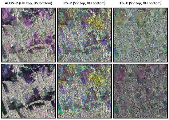 To further benefit from the positive capabilities of multiple frequency remote sensing, various studies aggregate datasets from different sensors. Li et al. [44] combine multi-temporal ALOS-PALSAR and RS2 products to improve classification accuracies in a tropical context, stressing the positive properties of L-band over C-band.
