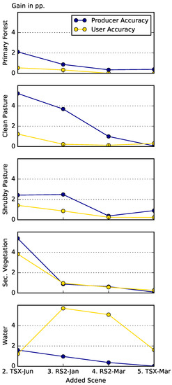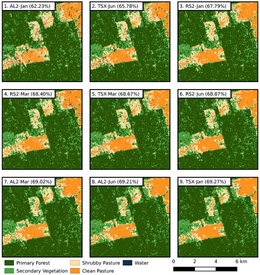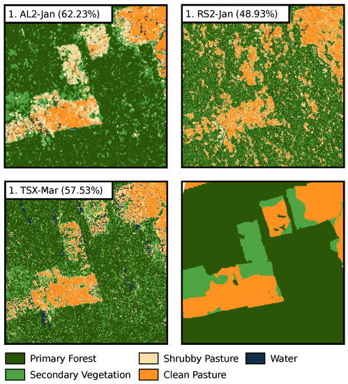 After scenes of each sensor are integrated, gains in accuracy are receding rapidly. Additionally, it appears that the advantages of AL2 and TSX do not appear to transfer over to the subsequent iterations. Two times RS2 is chosen over AL2 and TSX (iterations 5 and 6), yet all scenes are performing very similarly as they yield a low variance in accuracy. The range of accuracies for the fifth iteration is already very narrow at 0.13 pp., and the gain of the fifth over fourth iteration is only at 0.27 pp. The population error matrix (Table 3) reflects the stratified sampling, with Shrubby Pasture and Water being overrepresented. The confusion between pasture areas deserves special attention in particular. While TerraClass products imply Clean Pasture and Shrubby Pasture to be stable over the years, we observe these classes to be very ambiguous. Inspection of the land cover maps shows the confusion of Pasture classes to often affect continuous areas that are misattributed (see Figure 3). Counterintuitively, we observe that Shrubby Pasture areas do not necessarily align with regions of increased backscatter. Reasons might be a high inner-class and intra-annual variance, seasonality overall, and possibly limitations concerning the interpretation of the two classes in the TerraClass dataset. Intra-annual variance is of particular interest, as the underlying SAR acquisitions are spread over the entire dry period, which in general also coincide with a decrease of shrubby, in favor of clean pasture [59]. Since these effects are present in the training as well as testing data, classification outcomes are affected to a certain degree. In particular, results of classifications that might be capable of separating the pasture types might be lessened, as the inherent variance could introduce non-recoverable confusion. This is also indicated by the lower confusion between Secondary Vegetation and Shrubby Pasture, which can be separated more reliably despite being very similar in visual appearance. In contrast, the confusion between Secondary Vegetation and Primary Forest appears to be more random and is distributed spatially, while individual small regions of Secondary Vegetation can generally be made out. Consequently, these classes might not be classified well even with available L-band imagery, which might be a direct consequence of the saturation of L-band in environments of high biomass [69,70]. Comparing the reference classification as shown by Figure 3 with the classification outcomes of the first iteration, TSX shows the potential to improve on the Pasture classes. However, these potentials are not reflected after integration of TSX scenes into the fused product (Figure 4).