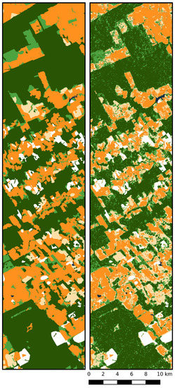 Comparing all mono-temporal, single-sensor results, i.e., the results achieved in the first wrapper iteration, it can be assessed that the AL2 data yields the highest accuracies, even when the weakest AL2 classification (AL2-Mar, 59.60%) performs better than the best non-AL2 dataset (TSX-Mar, 57.53%). As these accuracies are based on Olofsson et al. [68], calculation of standard errors of these accuracies is also feasible. Having used exhaustive TerraClass data as test data, the associated standard errors are all well below 0.001%. This is also emphasized by a visual interpretation of the best classification results, achieved by a single data source (see Figure 3 for reference). It can further be observed that TSX overall outperforms RS2, which is notable given the wavelength and the area of application, and might be a consequence of the favorable spatial resolution of TSX.