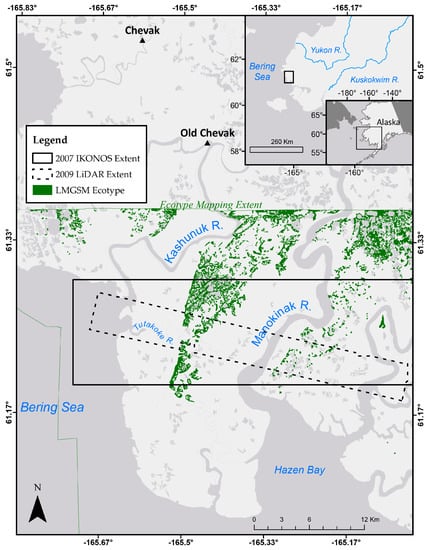 - Jorgenson, M.T.; Roth, J.E. Landscape Classification and Mapping for the Yukon-Kuskokwim Delta: Final Report Prepared for: U.S. Fish and Wildlife Service; ABR, Inc.-Environmental Research & Service: Fairbanks, AK, USA, 2010; p. 24. [Google Scholar]