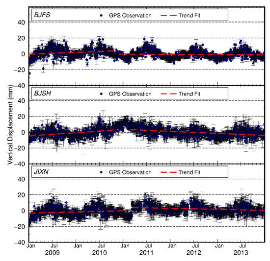 As mentioned above, the good seasonal correlation between GPS and GRACE signals indicates that the long-term uplifts revealed by GRACE solutions are probably true and mixed in the GPS measurements. Figure 3 shows the daily observations of three bedrock-located IGS CGPS stations (BJFS, BJSH, JIXN), since other CGPS stations’ data are only available after July 2010. The long-term linear trends of crustal uplift or subsidence are mainly dominated by surface mass loading and tectonic processes. The analysis of the three IGS CGPS stations (BJFS, BJSH, JIXN) suggests the slight change of linear trend around 2010. From 2009 to 2010, the linear trend of vertical displacements is uplift, which is consistent with the reported results of Wang et al. (2017) [17] and might imply the unloading of hydrological mass in NCP. However, the trend changes to lightly downward or relatively stable after the end of 2010, indicating the increase of hydrological mass loading in this area. These facts reveal that the severe water condition in NCP might has been alleviated in recent years.