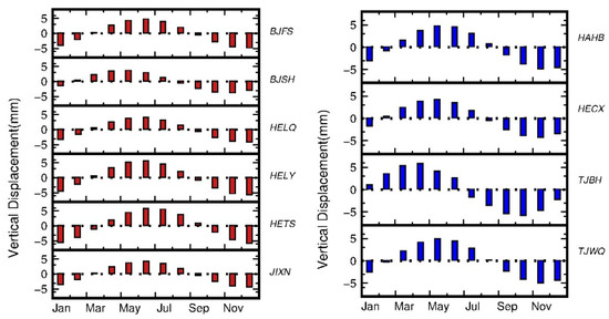 As presented in Table 1, except for HAHB, HECX, TJBH, and TJWQ stations, which are located on soft sediment and mainly distributed over the ECP area, the other CGPS stations are located on bedrock throughout the PP area and north part of ECP. Their monthly vertical displacement variations are displayed in Figure 5. For most bedrock-located CGPS stations (red bars, except for BJSH), whose vertical displacements mainly reflect elastic response of solid Earth’s surface to the loading of hydrological masses in this area, the maximum height occurs around early summer (June), and a minimum height takes place around early winter(December). This temporal pattern of vertical displacement should be mainly determined by the composite impact from agricultural groundwater extraction and climate factors. On one hand, over the whole region of NCP, especially the PP area, water-consumptive winter wheat is widely cultivated and agriculture is highly supported by artificial irrigation, which contribute greatly to groundwater depletion, as Hu et al. (2016) [40] reported that the correlation coefficients between irrigation amount and groundwater level anomalies is about −0.7. In addition, Tan et al. (2012) [41] showed that the maximum agricultural irrigation is concentrated in February to May in this region. On the other hand, precipitation is mainly focused on July and August (Figure 4c), which is stored in aquifers for next spring due to the lower irrigation requirement in those months. Hence, the vertical displacement due to groundwater loading displays a clear seasonal pattern of upward trend from January to June, when the groundwater is continuously extracted for irrigation, and downward trend from July to December, when the groundwater is recharged and accumulated from precipitation.