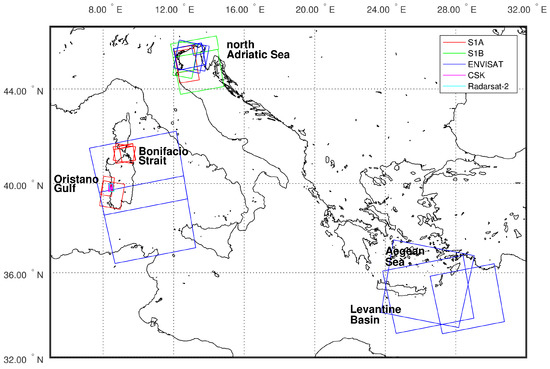 The frames of the Synthetic Aperture Radar images used in this work in the Mediterranean Sea. S1A/B: Sentinel-1 A/B; Envisat: ASAR WS; CSK: COSMO-SkyMed; Radarsat-2: Scansar Narrow.