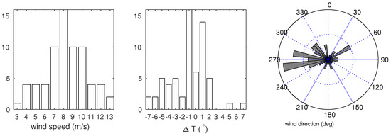 The images have been selected essentially in three coastal areas of the Mediterranean Sea (Figure 1), i.e., the northern Adriatic Sea, the Bonifacio Strait and the Oristano Gulf, according to the availability of the in situ data and the occurrence of moderate to strong wind conditions. Few images in the Levantine Basin have also been considered. They represent a large variety of possible geophysical conditions in these areas, as shown in Figure 2, which reports the statistical distributions of the wind speed, air-sea temperature difference and wind direction from the analysis fields of the European Centre for Medium-range Weather Forecasts (ECMWF) model related to the SAR images used in this work. The big deal of images has winds from 7 m/s to 10 m/s, but about ten have winds less than 6 m/s and greater than 10 m/s. The stability conditions present at the SAR overpasses were essentially neutral () with, however, a consistent number of images taken under unstable air-sea conditions. Finally, the wind direction distribution reflects that of the Mediterranean Sea, where the most probable winds come from the western quadrants [2,25].
