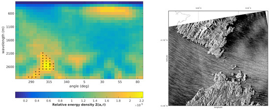 Since we are interested in identifying the directions of the most energetic backscatter structures, we have used the relative scale-angle energy density (Equation (3)) to find and select the scales and angles to reconstruct the SAR image. The resulting map of may be very different according to the geophysical phenomena imaged, i.e., ocean gravity waves, swell, atmospheric gravity waves, katabatic winds and so on. In general, all the geophysical phenomena with scale lengths inside the range of scales chosen for the 2D-CWT analysis appear in . An example is provided in Figure 3, which reports the relative scale-angle energy density (left panel) of the Sentinel-1A SAR image shown in the right panel. The energy density map, reported as a function of angles expressed in degree with respect to the geographic north (abscissae) and the scales in meters (ordinates) used in the 2D-CWT analysis, shows several relative maxima: the larger one, falling around 315 and 2600 m, accounts for the presence of the wind streaks visible in the western part of the image. The second one, falling at and 600 m, probably accounts for the sea wave fronts roughly perpendicular to the wind direction.