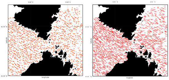 The aliased wind directions, obtained from the major axis orientation of the wind cells, are reported in the right panel of Figure 4. The spatial resolution of the wind cells is not regular, i.e., the backscatter cells linked to the wind are detected where they are located and not according to an a priori fixed spatial resolution. Hence, it is possible only to provide an effective spatial resolution of the resulting fields from the number of wind directions derived by the 2D-CWT. In the case of the image from Figure 4, this is of ≈3.2 km.