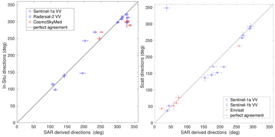 The comparison between time and space dependent data is never an easy task. For those between the SAR derived and the in situ directions, a fixed spatial window = 4000 m has been chosen, roughly corresponding to one fourth of the Oristano Gulf size, while a varying temporal window has been derived according to the wind speed , i.e., . This time window has been used to compute the mean values of the measured wind directions centred at the SAR pass time; the mean SAR directions have been obtained averaging the wind direction falling in the areas of radius centred at each in situ site. The mean values of the in situ wind directions have been obtained over a time window positioned before or after the SAR pass time depending if the wind blew from sea to land or vice-versa. The resulting comparison, shown in the left panel of Figure 6, is satisfactory, with and and . Here, we have to note that the in situ winds were measured at the sea–land interface, while the SAR ones were measured over the sea. Therefore, some discrepancies may arise from the different nature of the data.