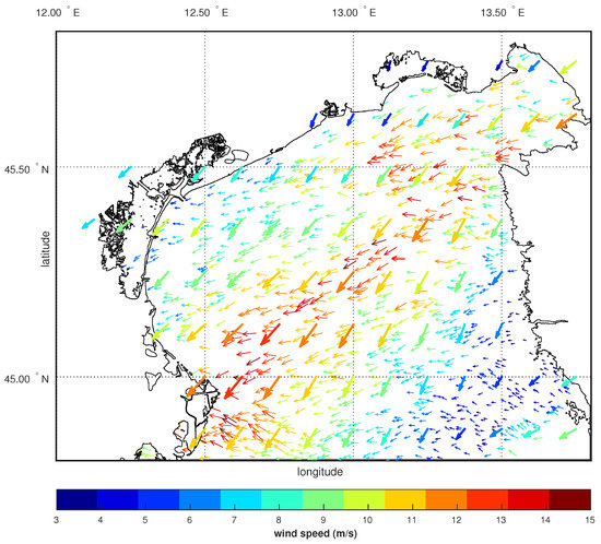 To illustrate these capabilities, an example of northeasterly wind in the northern Adriatic Sea as described by ECMWF and by SAR directions is shown in Figure 8, which reports the SAR derived directions overlapped by those from ECMWF (bold arrows) on the 6 February 2017 at 4:58 p.m. GMT.