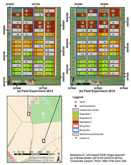 This study was carried out at Campus Klein-Altendorf (50°37′27″N, 6°59′16″E), the experimental campus of the agricultural faculty of the University of Bonn. For the growing periods of 2014 and 2015, a summer barley field experiment was set up where nine barley cultivars were cultivated with two different nitrogen treatments (40 and 80 kg N/ha) in three repetitions. The experiment was set up at separate locations on the experimental campus for 2014 and 2015, thus preventing issues with autocorrelation from measuring at the same location across years, as can be seen in Figure 1. Fifty-four plots were planted using a seeding density of 300 plants/m2 and a row spacing of 0.104 m. The plots had a size of 3 by 7 m, with each plot being divided into two parts, a 3 by 2 m area where the destructive biomass measurements were carried out and a 3 by 5 m area for all other non-destructive measurements. The day of seeding for the 2014 field experiment was 13 March 2014. For the 2015 field experiment, the plots were seeded on 23 March 2015.