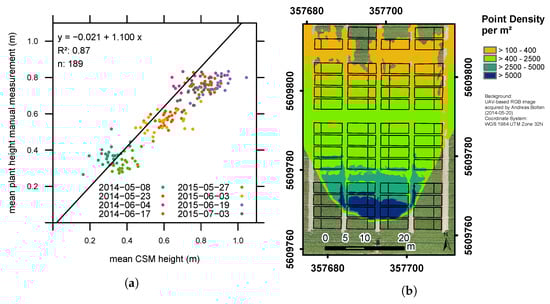 (a) Scatter plot of CSM-derived plant height vs. manually measured plant height for the selected CSMs of the noon acquisition date, p-value < 0.0001; and (b) overview of covered plots and point density per m2 for 8 May 2014, noon acquisition date.
