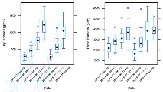 There is a higher variability in the fresh biomass values for each measuring date when compared to the dry biomass values, as can be seen in the boxplots in Figure 3. This suggests that plant water content varies considerably across the different plots for each measurement date.