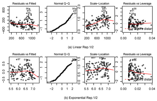 Diagnostic plots for two exemplary regressions: (a) linear regression for Repetitions 1 and 2; and (b) exponential regression for Repetitions 1 and 2.