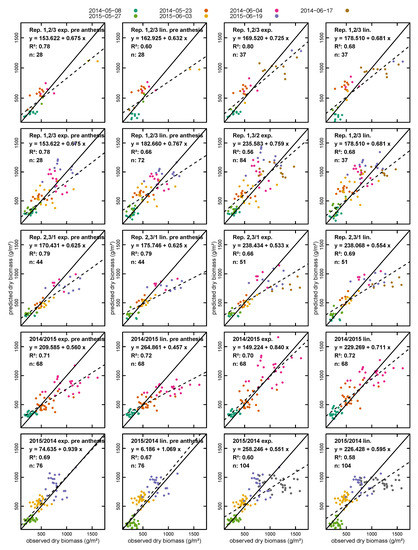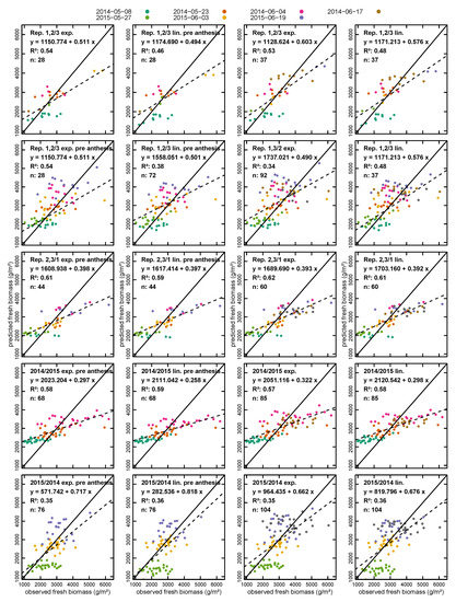 Table 3 shows the details of the performed regressions. The estimation of dry biomass performs much better than that of fresh biomass, with values between 0.58 and 0.72 for the simple linear regression and values between 0.73 and 0.79 for the exponential regression. In contrast, the regression for the fresh biomass resulted in values between 0.36 and 0.59 for linear and 0.37 and 0.63 for the exponential regression. Looking at the dry biomass regression models and comparing the pre-anthesis regressions to the corresponding regressions for the whole growing period, it can be seen that pre-anthesis performs better with higher and lower RMSE, especially for the linear regression models. For fresh biomass, where all models perform worse than the corresponding dry biomass models, the difference between pre-anthesis and models based on data from the whole growing period is less pronounced. Of the exponential dry biomass models, only the of the model based on Repetitions 1 and 3 is more than one standard deviation higher than the mean of the 10,000 randomized 70%/30% models. Along with the model calibrated with the data of the 2015 measurements, is highest for both exponential and linear regression as well as the whole period and only the pre-anthesis period. For the fresh biomass, the difference between these two dataset partitions and the others is even more pronounced. The size of the calibration dataset does not appear to have a direct influence on the performance of the regressions.