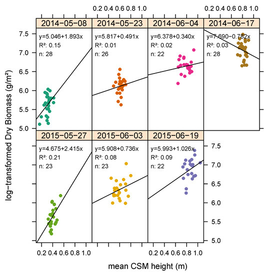 Figure 7 shows that, unlike the comparison along the growing season, for the single measurement dates, the relationship between dry biomass and mean CSM-derived plant height per plot is rather weak, confirming the results of [17]. Therefore, individual regression models for predicting biomass per date were not created.