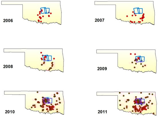 The Wilzetta Fault Zone is a large, 200 km long Pennsylvanian fault system [,] with a predominantly shale rock type from the Late Pennsylvanian Vanoss Group []. Main production of oil and gas in this area occurred in the 1950’s and 60’s [,], and in 1993 the area transitioned into a location for salt-water disposal wells (Type II Injection Wells) []. Disposal is primarily in the Hunton Limestone and the Arbuckle Group at bottom well depths of 1.3 and 2.1 km, respectively []. In November 2011, it was the location of the second strongest recorded earthquake in Oklahoma history [,]. Three earthquakes of Mw 5.0, 5.7 and 5.0 occurred within 4 days along the strike-slip Meeker–Prague fault, a 20 km splay off the main Wilzetta Fault Zone [], approximately 4 miles east of the town of Sparks, Oklahoma. The epicenters of these events were located 180 km from the nearest known Quaternary-active faults []. This series of earthquakes is the largest ever correlated to wastewater injection []. Figure 8 shows the location of 2.9 Mw or greater earthquakes that occurred between 2006 and 2011. The cluster of earthquakes along the Meeker–Prague fault splay is easily observed.