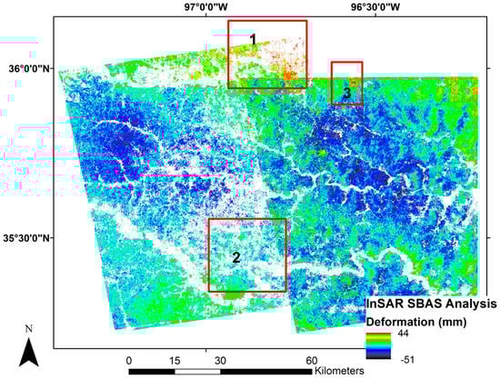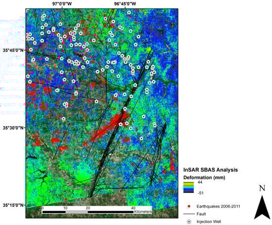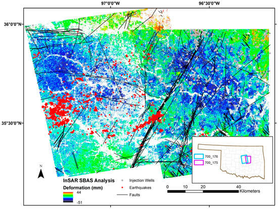 Our SBAS InSAR analysis shows regional deformation and the Meeker–Prague Fault splay displaying a mild correlation with injection well locations, whereas uplift identified in results for Cushing, Oklahoma has a significant impact due to the city’s importance in the oil and gas industry. Results in our final area, southeast of Drumright, Oklahoma presents some intriguing questions as to the magnitude of deformation observed, yet the lack of local seismicity in the area.