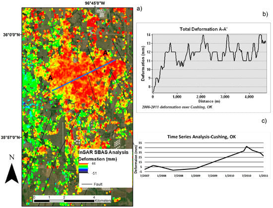 Area of Interest One-Cushing, Oklahoma: (a) Results of InSAR analysis showing total deformation for the timeframe of 2006–2011; (b) Horizontal depiction of total deformation along profile line A-A’; (c) Time series analysis for city of Cushing, Oklahoma. All deformation is measured in LOS. Negative values represent movement away from the satellite, whereas positive values indicate movement towards the satellite.