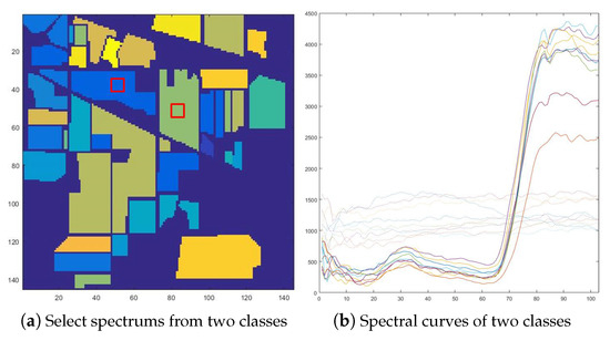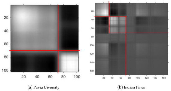 According to Equation (2), the correlation matrices for the Pavia University dataset and the Indian Pines dataset are shown in Figure 3, where both horizontal and vertical axes represent bands of the dataset. We use color to represent the degree of correlation. Darker indicates less correlation, while lighter represents more correlation. On the basis of the exhibited correlation in Figure 3, we manually divide the spectrum in each dataset into some segments. Specifically, we divide the spectrum of the Pavia University dataset into two segments, including bands 1–75 and bands 75–103. Similarly, the Indian Pines dataset is divided into three segments, namely bands 1–30, bands 30–75, and bands 75–169. It should be noted that we permit a bit of overlapping in different segments.