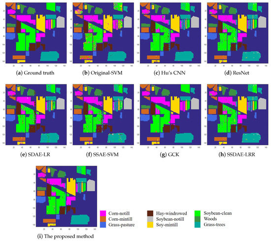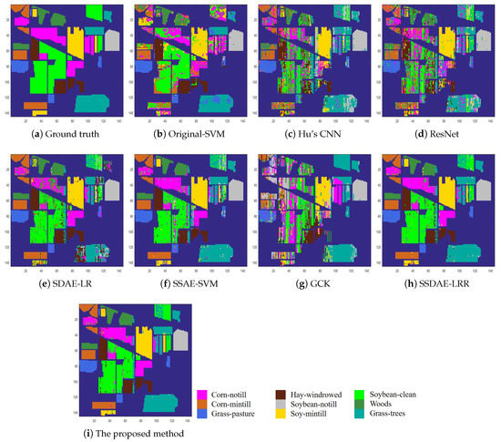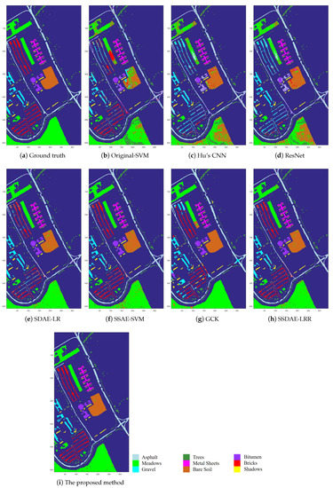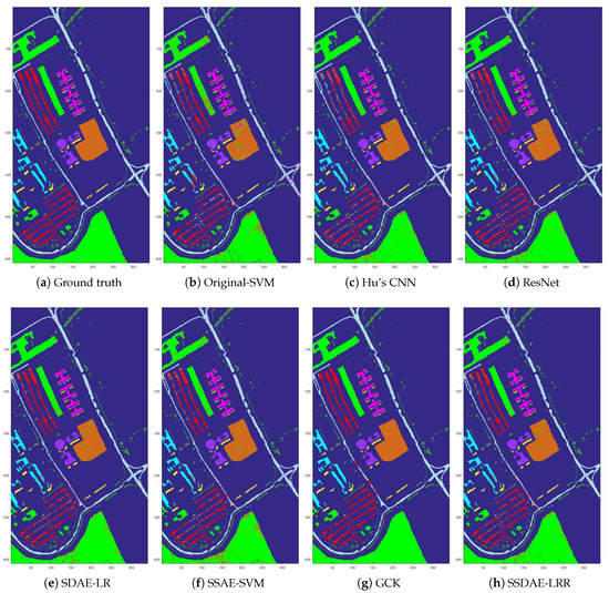 Table 3 and Table 4 summarize the numerical classification results of all methods on two HSI datasets, where 200 labelled samples per class were used for training (a total of 1800 samples). We can find that the proposed method produced much higher classification accuracy than that of SVM. For example, on the Pavia University dataset, the proposed method outperformed SVM by 7.37% in OA. On the Indian Pines dataset, the proposed method outperformed SVM by 3.60% in OA. This demonstrates that the deeply learned feature performs better than the heuristically shallow feature. Moreover, the proposed method even outperformed the state-of-the-art supervised feature learning method with deep neural networks—Hu’s CNN and ResNet. This is because training deep neural networks with limited labelled samples is prone to becoming trapped in local minima, while the proposed unsupervised deep feature learning scheme have sufficient unlabelled samples for training. Compared with SDAE-LR, SSAE-SVM, and SSDAE-LRR, the proposed method improved the OA by 3.58%, 5.68%, and 2.93% on the Pavia University dataset, and the improvements to Indian Pines dataset was up to 3.36%, 5.22%, and 3.97%, respectively. On the Pavia University dataset and the Indian Pines dataset, GCK outperformed the proposed method by 0.57% and 4.75% in OA, respectively. However, in Table 5 and Table 6, when only 100 labelled samples were used for training, the proposed method outperformed GCK by 7.66% and 28.66% in OA on the Pavia University dataset and the Indian Pines dataset. We can conclude that the proposed method outperformed GCK in HSI classification with small labelled samples. These demonstrate the effectiveness of the spatial-spectral deep feature as well as the robust low-rank representation based classifier.