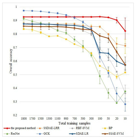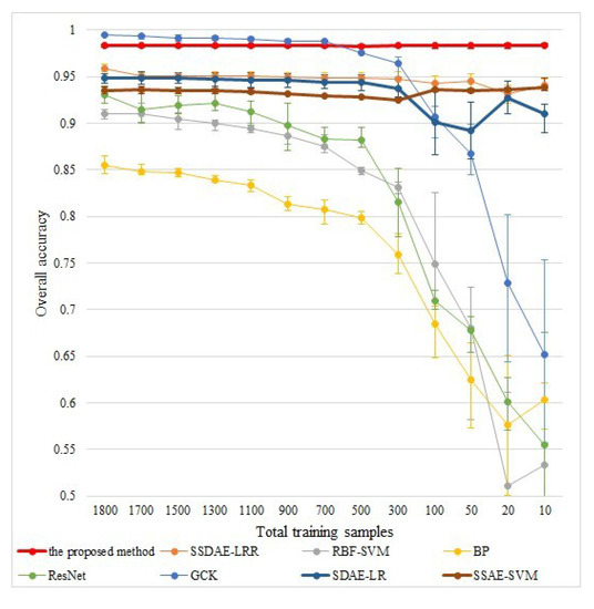 When the total number of the labelled samples ranges from 10 to 1800 (we balanced the number of samples in each class as much as possible), the classification results for all methods on two datasets are shown in Figure 12 and Figure 13. In Figure 12, we can find that when the total labelled samples were more than 900 (samples per class were more than 100), the classification accuracy for all methods was still over 81%, and the proposed method was comparable to GCK. When the total number of labelled samples decreased below 900 (samples per class were less than 100), the performances of RBF-SVM, BP, ResNet, and GCK dropped sharply. Similar phenomena can also be observed in Figure 13. This demonstrates that both supervised-learned features and unsupervised-learned shallow features are sensitive to the amount of labelled samples. In contrast, the proposed method preserved its performance well, even when the total number of labelled samples was 10 (one sample per class), as shown in Figure 12; on the Pavia University dataset, the overall accuracy was 98.40%, and the performances of SSDAE-LRR, SDAE-LR, and SSAE-SVM dropped slightly. These demonstrate that both the unsupervised-learned deep features performed robustly to the limited labelled sample; although SDAE-LR is an supervised method, it can utilise more unlabelled information in the training phase. Since the proposed SSDAE feature further considers the spatial information as well as embedding it into a robust classifier, the proposed method outperformed SSDAE-LRR in all cases. Moreover, the superiority was increased when the total number of labelled samples dropped, especially in Figure 13.