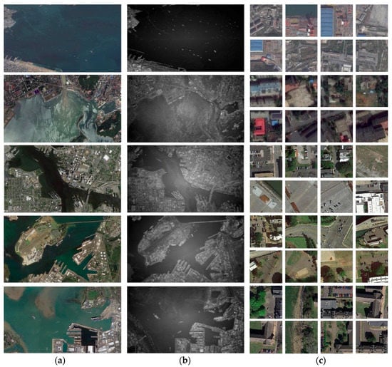 First, these features are adopted to extract saliency maps (shown in Figure 2b) from the original unlabeled remote-sensing images (shown in Figure 2a). Then, the saliency maps are evenly divided into patches with a size of 256 × 256 and the mean saliency of these patches is computed, on which basis the mean saliency of the whole image is calculated. Finally, those unlabeled patches whose saliency is larger than that of the whole image (shown in Figure 2c) are retained for further unsupervised feature learning.