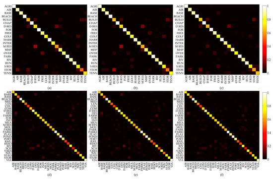 Confusion matrices of Plain-CNN, SF-CNN, and SSF-CNN on the UCMerced and AID datasets. (a) Plain-CNN on UCMerced; (b) SF-CNN on UCMerced; (c) SSF-CNN on UCMerced; (d) Plain-CNN on AID; (e) SF-CNN on AID; (f) SSF-CNN on AID.