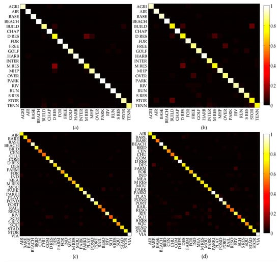 Confusion matrices of ImageNet-AlexNet and SSF-AlexNet on the UCMerced and AID datasets. (a) ImageNet-AlexNet on UCMerced; (b) SSF-AlexNet on UCMerced; (c) ImageNet-AlexNet on AID; (d) SSF-AlexNet on AID.
