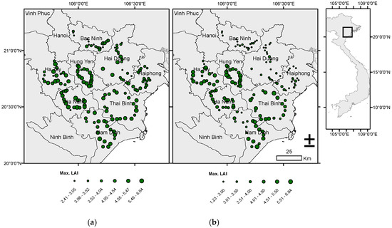 Maps of the study site in the Red River Delta, Vietnam. Graduated symbols indicate the magnitude of maximum LAI measured in situ during the 2016: spring (a); and summer (b) seasons.