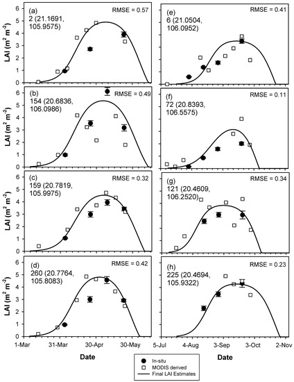 The final LAI estimates for the Red River Delta from MODIS obtained by smoothing with a logistic function in this study have a comparable range of RMSE (0.11–0.57) as previous studies involving higher resolution reflectance data from Sentinel-2 and the same inverted PROSAIL Radiative Transfer Model in Spain (0.56), Italy (0.82), and Greece (0.77) [41]. However, this previous approach did not involve smoothing using a logistic function. Time series observation indicates that LAI estimates from MODIS in this present study showed occasional unexpected pronounced drops in LAI values (Figure 3) similar to ones previously found in Spain [41], which was likely due to cloud obstruction. Time series analysis also reveals some degree of uncertainty in the in situ LAI data and it also shows, although not as pronounced as the MODIS-derived LAI, some anomaly in the LAI dynamics during the growing season. LAI data obtained from PocketLAI have been known to have limitations vis-à-vis the conventional method [55]. Given such occasional unexpected fluctuation of LAI time series from MODIS and in situ data, smoothing using a logistic function in this study is strongly justifiable to allow reliable LAI evolution data during the growing season. Further investigation is needed to evaluate whether, in some cases, the drop in LAI values during the growing season may be caused by environmental stresses. In such case, however, the LAI data are expected to remain low for the remainder of the season following the drop, something that was not observed in this present study in the Red River Delta during the 2016 growing seasons, inferring that rice in this area during these particular seasons did not suffer major stresses. This inference is supported by the good rice growing conditions reported by farmers based on the field interviews and expert opinions. Another possible reason for the discrepancy between MODIS derived LAI versus ground data was the heterogeneity of the surface conditions captured within MODIS 250-m pixels. Such phenomena had been prevented and minimized, however, by requiring in-situ field observations taken at locations that were relatively homogenous, conditions that are commonly found in the study site.