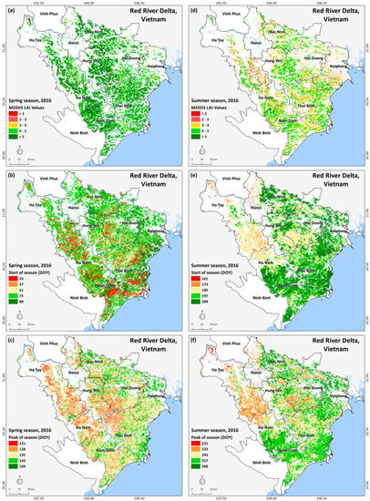 Regarding crop status, the in situ LAI observations collected at the study sites indicated variation in maximum rice LAI across seasons (spring vs. summer). In general, higher maximum LAI values were observed during the spring season with the exception of some areas in the western part of Hay Tay and Hung Yen provinces where the reverse was the case (Figure 1).