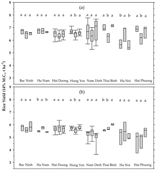 Box plots of rice yield aggregated at the district level summarized for eight provinces in the Red River Delta of Vietnam (study sites) for the 2016: spring (a); and summer (b) seasons. In each province, the three box plots represent yield data derived from MODIS, Sentinel-1, and an official source, sequentially, with the corresponding group of three letters near the top of the graphs representing analysis of variance least significant difference, ANOVA LSD, assignment comparing the three datasets.