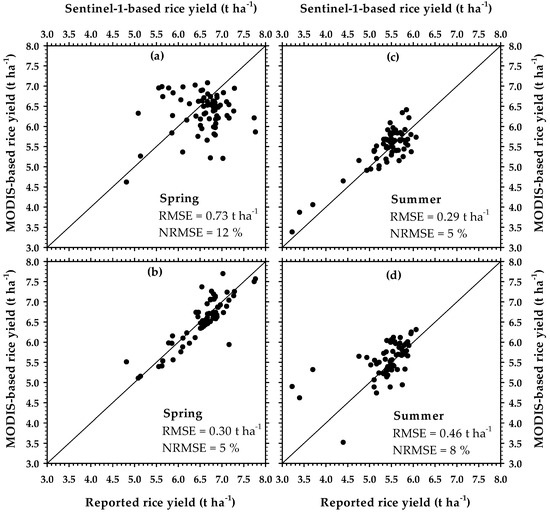 Similarly, comparison of yield datasets at district-level aggregation shows that MODIS-derived yield was in agreement with reported yield from the government as shown by no significant differences in two datasets based on ANOVA LSD test results in 15 out of 16 cases (Figure 5). Comparisons between MODIS-derived yields and SAR-derived yields, however, show some discrepancies, especially in the spring season. Scatter plots comparing yield results at district-level aggregation from MODIS against SAR and reported official yield are shown in Figure 6. MODIS-derived yield against SAR-based yield has RMSE of 0.73 and 0.29 t ha−1 (NRMSE of 12% and 5%) for the spring and summer season, respectively. MODIS-derived rice yield data against reported official yield have RMSE of 0.30 and 0.46 t ha−1 (NRMSE of 5% and 8%) for the spring and summer season, respectively (Figure 6). The higher yield values found in the spring than in the summer season are consistent with both observations and simulation of maximum LAI (Table 3 and Figure 1, Figure 3 and Figure 6).