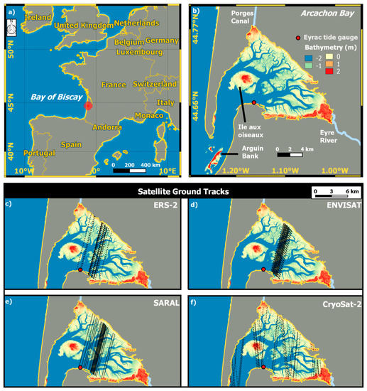 (a) The Arcachon lagoon is located in the Bay of Biscay along the south part of the French Atlantic coast. (b) The Arcachon lagoon is a mesotidal shallow semi-confined lagoon. Several altimetry missions’ ground-tracks cover the lagoon: (c) ERS-2 (1993–2003, since 2003 ERS-2 has experienced a number of failures), (d) ENVISAT (2002–2010 on the nominal orbit), (e) SARAL (2013–2016 on the nominal orbit), and (f) CryoSat-2 (since 2010).