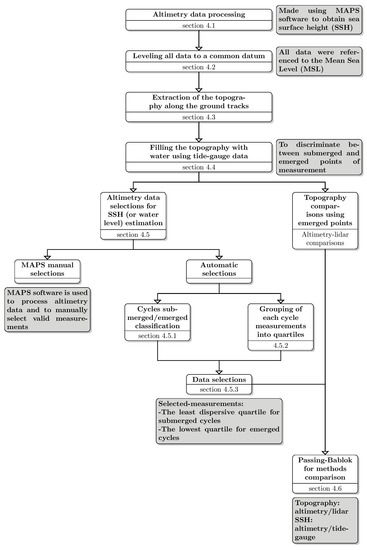 For comparison purposes, they were all referenced to the Mean Sea Level (MSL). Datum conversion for all data (altimetry, topography, and tide gauge data) were made using the French maritime altimetry references [32] giving the vertical differences between the different datum (−44.8 m between WGS84 and the French chart, −1.98 m between the French chart and the French reference system, and −2.48 m between the French chart and the MSL).