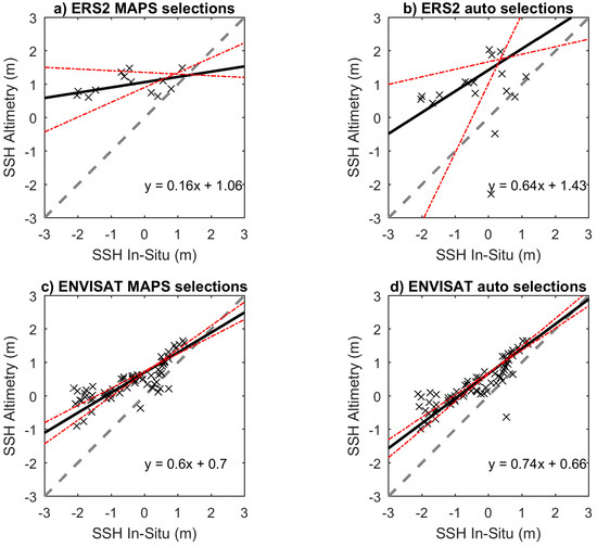 ERS-2 showed the most unsatisfactory results with slopes lower than 0.64 and intercepts higher than 1 (Table 2). The results obtained by the Passing-Bablok method could not be interpreted for ENVISAT MAPS selections since no linear relationship exists with the tide gauge measurements (a break is observed in the slope at 0 m (Figure 7c)). Low accuracy for MAPS selections made for ENVISAT could be inferred from the RMSE and the mean bias obtained (1.04 m and 0.88 m respectively). The automatic selections significantly improved the estimation of SSH obtained using ENVISAT data and rendered the linearity test positive. The slopes given by ENVISAT increased from 0.60 to 0.74 and were accompanied by an improvement of R (from 0.82 to 0.86) and RMSE that remains important (RMSE~0.92 m) (Table 2). As explained in Section 4.6, the method does not show proportional or constant biases if 1 belongs to the slope CI (slope(LB) < 1 < slope(UB)) and 0 belongs to the intercept CI (intercept (LB) < 0 < intercept (UB)) respectively. For SARAL, a better result is obtained using the automatic selection showing only constant bias with no proportional bias (the confidence interval of the slope contains the value 1). Slight proportional and constant biases are obtained for MAPS selections. MAPS selections present better results for CryoSat-2 that shows slight constant biases with no proportional biases for the two types of selections.