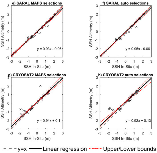 Comparisons between in-situ and altimetry-based SSH for ERS-2 (a,b), ENVISAT (c,d), SARAL (e,f), and CryoSat-2 (g,h) using two different approaches for selecting the valid measurements: MAPS manual selections (left) and automatic selections (right).