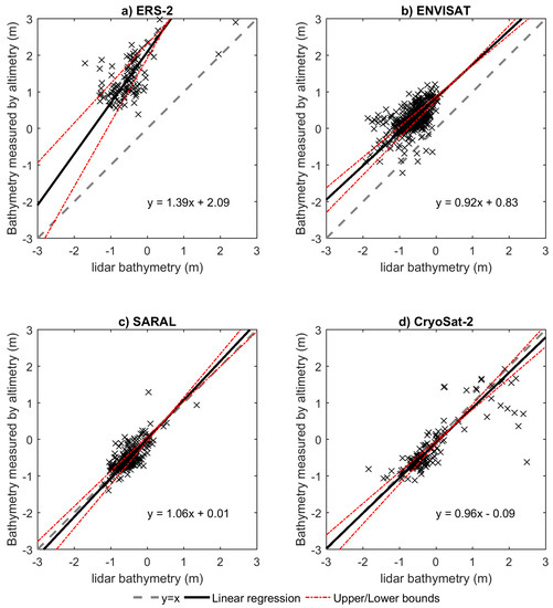 Comparisons between lidar and Altimetry-based topography measurements for: (a) ERS-2, (b) ENVISAT, (c) SARAL, and (d) CryoSat-2.